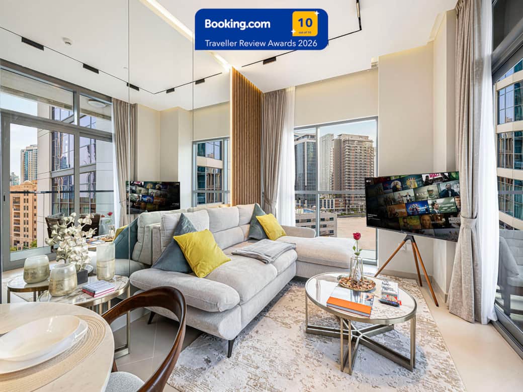 Proudly rated 10/10 at the Booking.com Traveller Review Awards 2026, our Downtown Dubai apartment is loved for its direct Burj Khalifa views, spotless standards, and refined Italian comfort.